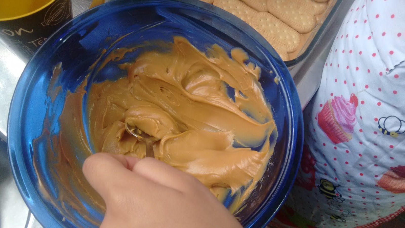 Em uma vasilha, misture o doce de leite com a nata até ficar homogêneo (como diz a Lulu, uma coisa só).